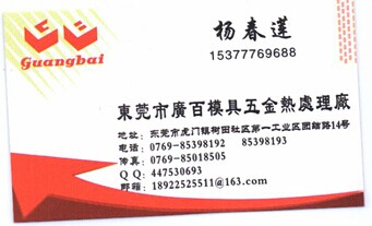 东莞市虎门广百模具五金热处理厂成立於1990年,经过数十年的发展,规摸不断扩大,现位于东莞市虎门镇树田村第一工业区团结路东14号,厂区占的面积3000多平方米,主要业务是承接各国钢材的五金、合金、鈹铜、高速钢的热处理、深冷处理(-196℃)、气体氮化、液体氮化、QPQ盐浴生產线、高频粹火、防銹发黑和渗碳、表面加硬及不銹钢光亮处理。